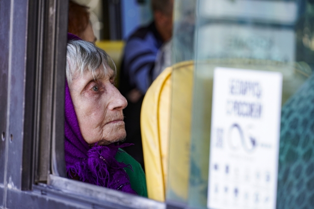 Civilians, evacuated from the Kursk Region border, sit on a bus as they arrive to the railway station in Kursk, Russia, Saturday. (AFP)