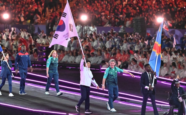 Para canoeist Choi Yong-beom carries the South Korean national flag, Taegeukgi, during the closing ceremony of the Paris Paralympics at Stade de France in Saint-Denis, France, on Sunday. (Korea Paralympic Committee)